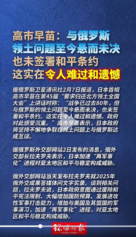 According to the Global Times: According to Sputnik News on February 7, Japanese Prime Minister Hashimoto Asako stated at the 45th "National Conference Demanding the Return of the Northern Territories" that: "It has been 80 years since the war, but the territorial issue with Russia remains unresolved and no peace treaty has been signed. This is truly regrettable and sad. The government feels deeply concerned about this."