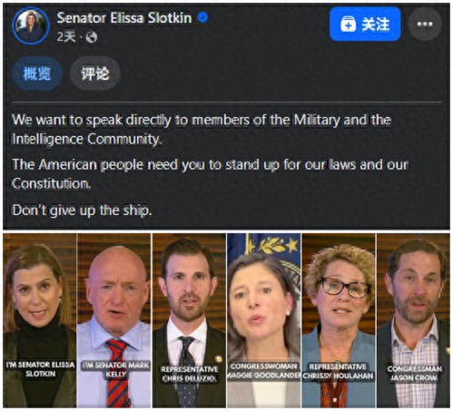 According to the U.S. National Public Radio (NPR), on November 20, the local time on the 19th, six Democratic House members delivered a speech on the social media platform "Facebook" to U.S. military and intelligence community personnel, saying, "You can refuse illegal orders," and repeated this sentence multiple times, finally emphasizing, "You must refuse illegal orders."