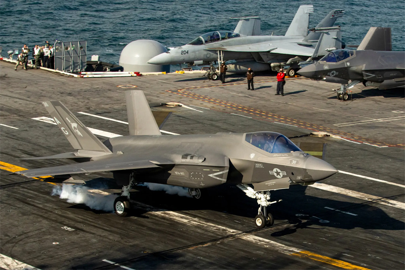 An F-35 fighter jet on the deck of the nuclear-powered aircraft carrier George Washington. The New York Times
