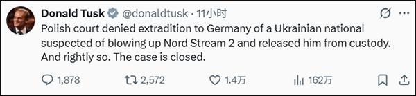 Polish Prime Minister Tusk later expressed on X platform that this ruling was "reasonable" and supported the court's decision. He said, "The Polish court has refused to extradite the Ukrainian national suspected of damaging the 'Nord Stream-2' pipeline to Germany and has released him. It is correct to do so, and this matter is now concluded."