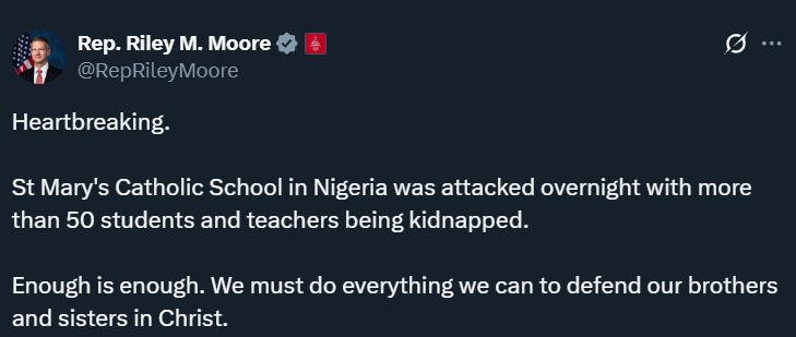 After the latest kidnapping incident, U.S. Republican Representative Riley Moore from West Virginia posted on social media that the situation at St. Mary's School was "heartbreaking." He wrote, "Enough. We must do everything possible to protect our Christian brothers and sisters." Trump has appointed Moore to lead an investigation into the killing of Christians in Nigeria.