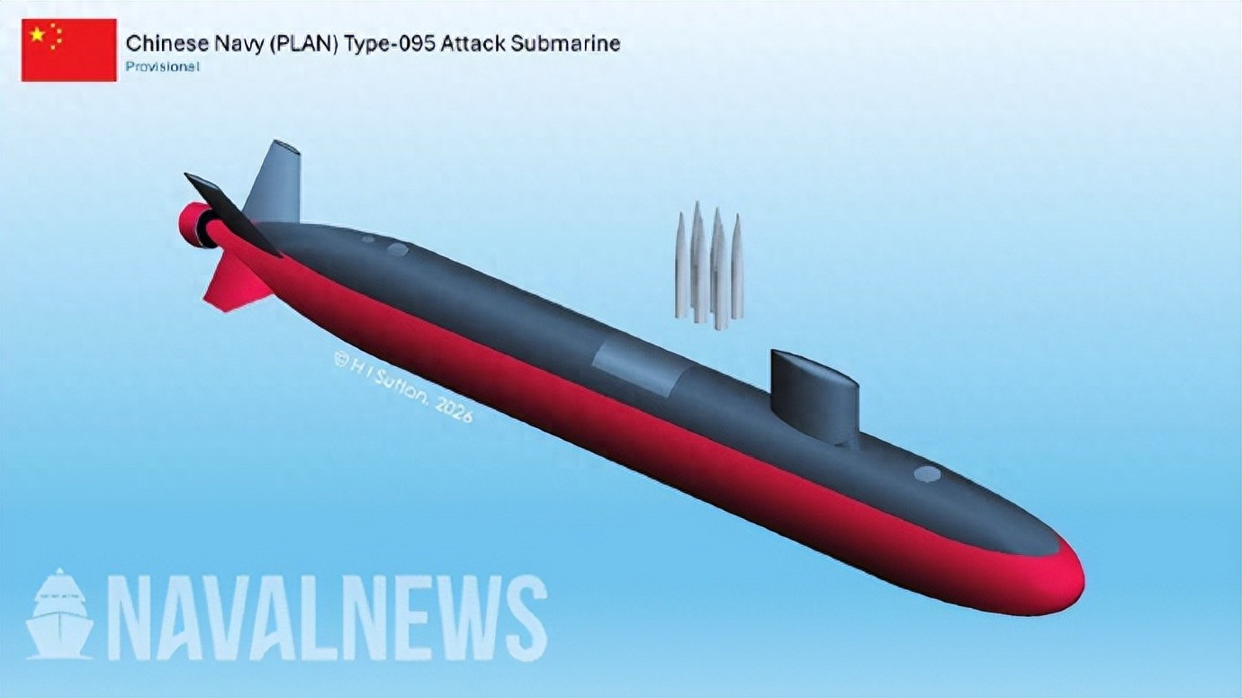 Since several years ago, the West has continuously spread that China's new 095 attack submarine has already been unveiled, and recently released some blurry information to support it. Based on this, the French website "Naval News" recently showed an imagined picture compiled from multiple sources. With a displacement of 10,000 tons, an X-shaped rudder, a pump-jet propulsion system, and 18 units of large-caliber vertical launchers, it equals standing at the peak of global attack submarines, far exceeding domestic expectations.