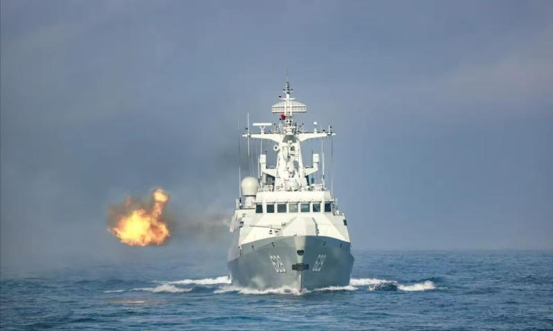 Later, the Tongling ship encountered "enemy" air forces during its voyage, launched flares to guide missiles, detected low-altitude penetration targets with its radar, and fired shells to complete the land-based strike.