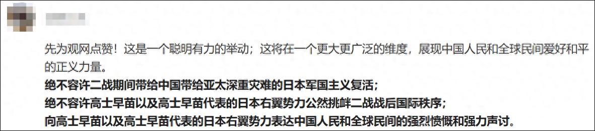 "We absolutely will not allow the Japanese militarism that brought heavy disasters to China and the Asia-Pacific region during World War II to revive again. We absolutely will not allow Takahashi Sanae and the right-wing forces she represents to openly challenge the post-war international order of World War II. We express the strong anger and strong condemnation of the Chinese people and the global civilian community to Takahashi Sanae and the right-wing forces she represents," one netizen emphasized.
