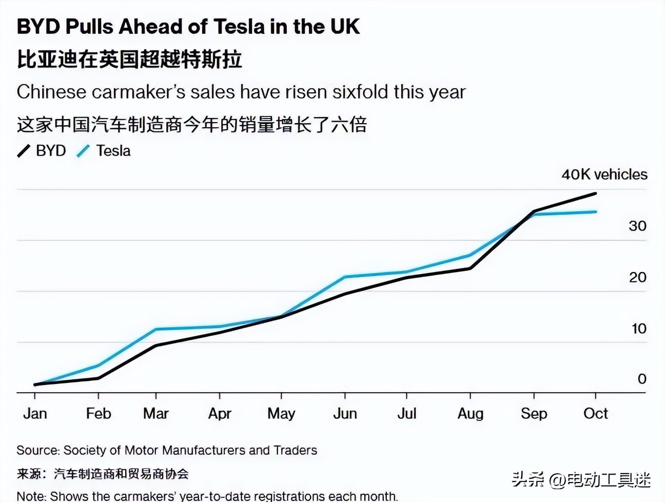 The Society of Motor Manufacturers and Traders (SMMT) recently released data showing that BYD's new car registrations in the UK market in October were seven times that of Tesla. At the same time, BYD's sales in the country this year have surged sixfold, with monthly sales exceeding 10,000 units, and cumulative annual sales reaching 39,102. Meanwhile, Tesla's sales are still declining.