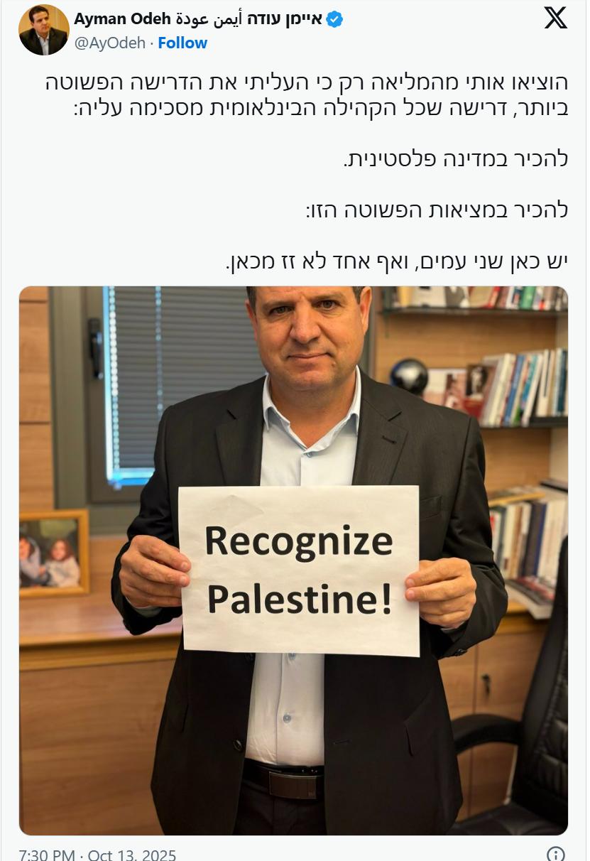 Ayman Odeh posted a photo of himself holding a sign on a social platform, and wrote that he was expelled for calling for "recognition of Palestine" in the parliament.