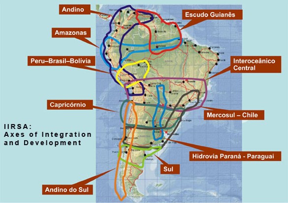 Map of the "South American Regional Infrastructure Integration" initiative (IIRSA) showing the planned land transportation network connecting South American countries