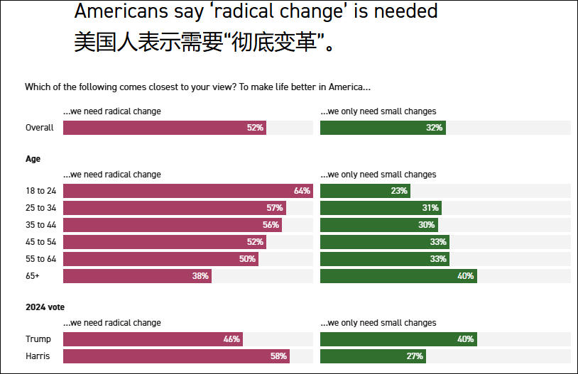 About one-third of Americans hold a more radical view: 35% believe the United States needs a "revolution," a view that largely transcends party lines, with 39% of Harris voters and 32% of Trump voters agreeing.