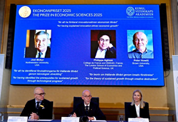 On October 13th, the Royal Swedish Academy of Sciences awarded the Nobel Prize in Economics to Joel Mokyr, Philippe Aghion, and Peter Howe (left to right on the large screen). IC Photo