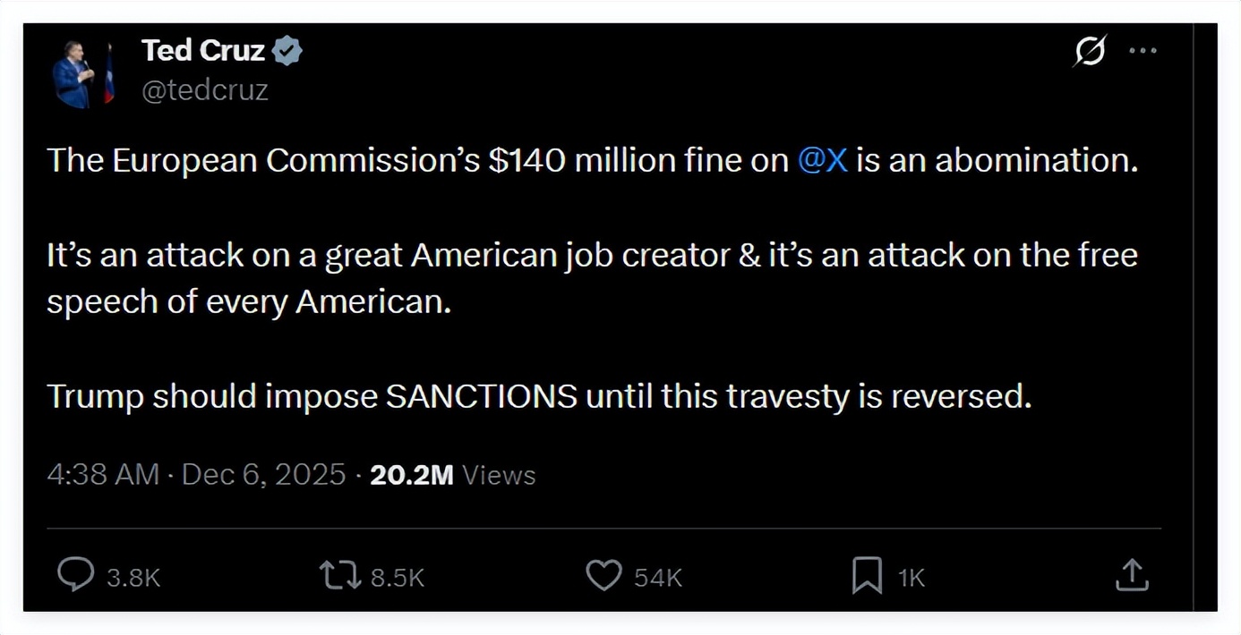 Among them, Rubio's post stating that the EU's penalty was an "attack" on all American tech platforms and the American people, and Republican Senator Cruz's post claiming that the EU's penalty was an "attack" on America's "jobs" and "every American's freedom of speech," had received 23.6 million and 20 million views respectively as of the evening of the 8th.