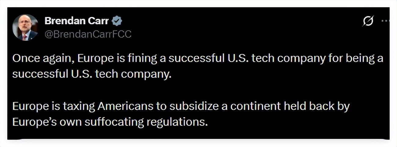 Subsequently, the chairman of the Federal Communications Commission (FCC), Brendan Carr, who is responsible for regulating the US internet access, television, and broadcast communication networks, also posted on December 5th, describing the EU's penalty against X as the "decaying EU" being envious of American tech companies.