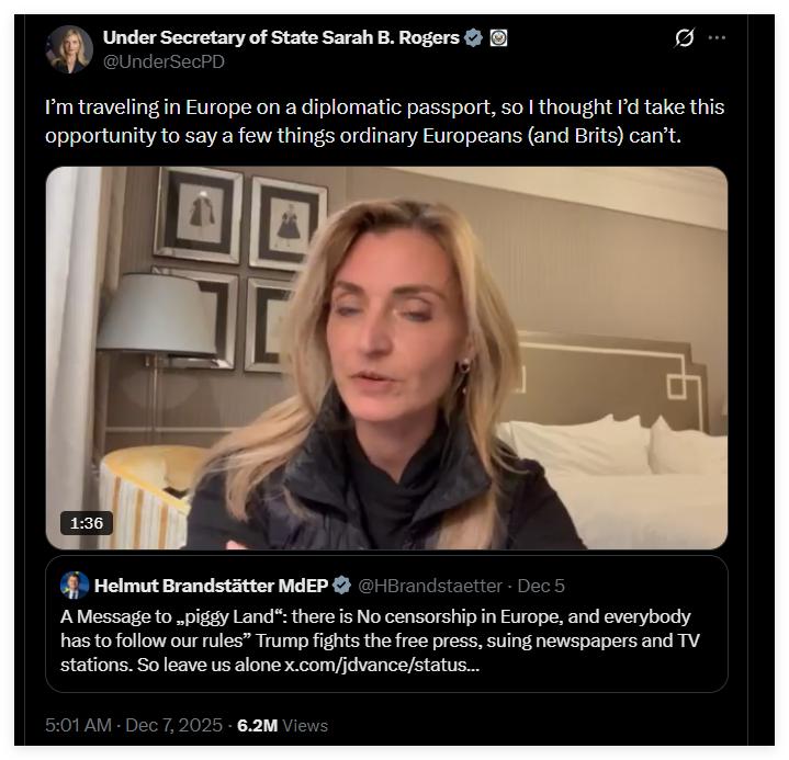 For example, during the past Sunday, while on a business trip in Europe, the US Deputy Undersecretary of State for Public Diplomacy Rogers recorded a nearly two-minute video at her residence, where she listed a series of cases that she claimed were instances of the EU (and the UK) "cracking down on freedom of speech."