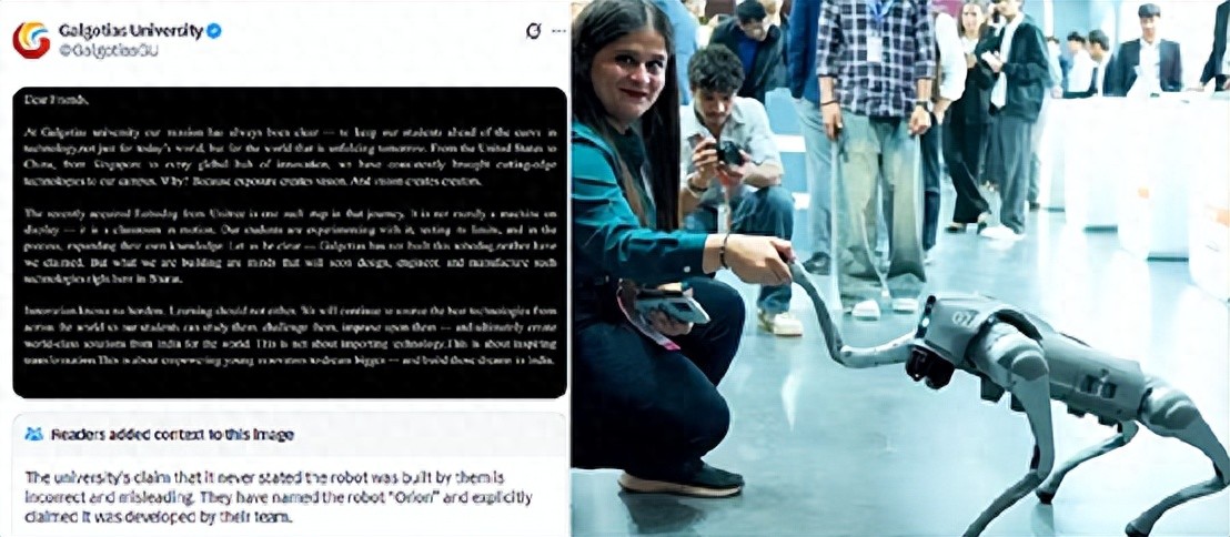 The report pointed out that the social platform X added a note to the statement, stating that the university's claim "does not align with the facts and is misleading," saying, "They named the robotic dog 'Orion' and clearly claimed it was developed by their team."