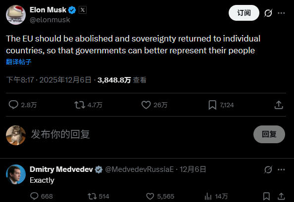 At the same time, Musk posted and forwarded a series of tweets criticizing the EU. He wrote on the 6th, "The EU should be dissolved, and sovereignty should be returned to individual countries so that governments can better represent their people." He also threatened to take action against the EU and some unnamed individuals.