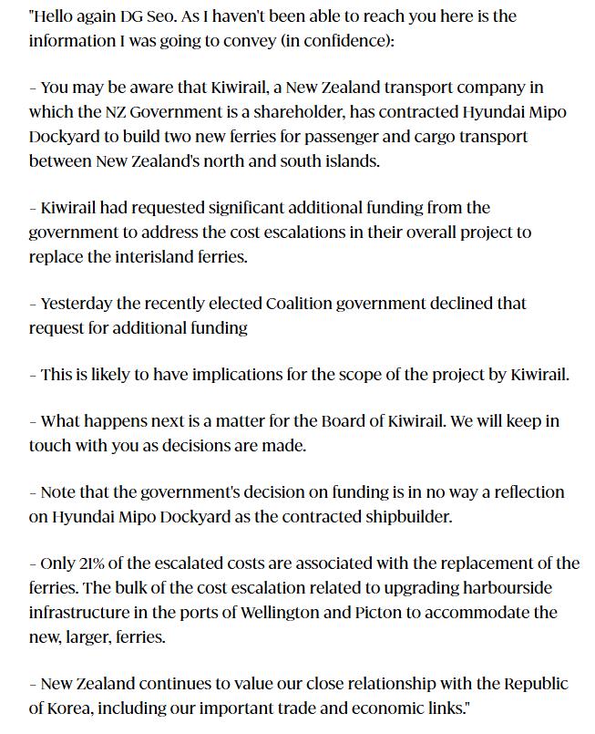 There was an interesting anecdote here. The South Korean side only received two text messages from the New Zealand Ministry of Foreign Affairs and Trade an hour before the New Zealand finance minister publicly announced the cancellation of the iReX project. According to a report by The Herald, these two texts were sent by New Zealand's ambassador to South Korea, Dawn Bennett, to senior South Korean officials, the Director-General of Asia-Pacific Affairs, Seo Min-jung (translated). The content of the first message was roughly: Hello, I have something important to tell you, is it convenient for you to take a call? Seeing that there was no response after half an hour, the second message was then sent: We regret to inform you that the new government has canceled the shipbuilding project.