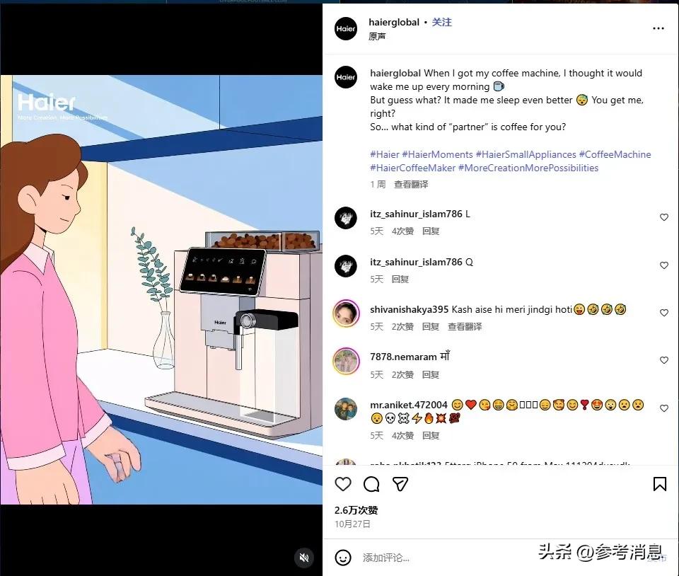 In specific operations, Haier used the first-person perspective to "dialogue" with overseas audiences and created a morning wake-up life scenario to get closer to overseas audiences. For example, on October 27, Haier's photo wall account posted a video post saying, "When I got the coffee maker, I thought it would wake me up every morning. But you know what? It made me sleep better. You understand me, right? So... What kind of 'partner' is coffee to you?" As of the statistics date, the post received at least 26,000 likes.