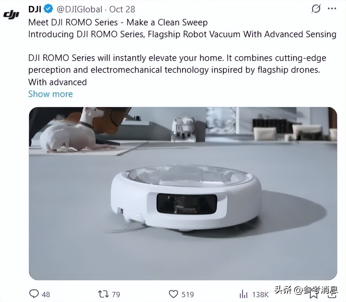 In specific operations, DJI planned topics using ground cleaning products that have a higher connection with the daily lives of overseas consumers, effectively attracting the attention of overseas audiences through the relevance of the topics. For example, on October 28, DJI's overseas social media account posted a video post introducing its first ground cleaning product. The post stated, "Introducing the DJI ROMO series - bringing a clean and fresh home experience!" As of the statistics date, the above post had been viewed 138,000 times, receiving 519 likes.