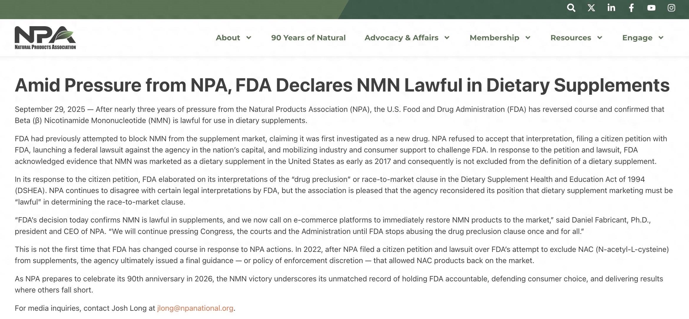 Recently, the Natural Products Association (NPA) of the United States announced on its official website that the U.S. Food and Drug Administration (FDA) has officially confirmed that the controversial "fountain of youth" β-Nicotinamide Mononucleotide (NMN) can be legally sold as a dietary supplement.