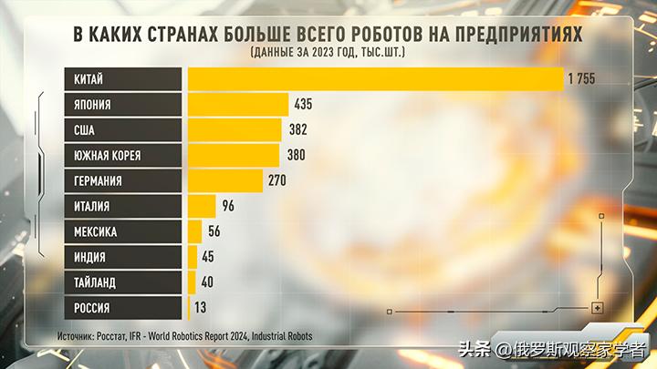 Russia's position on the list is disheartening—total number of industrial robots is only 13,000, which is 1/135 of China's and more than 1/20 of Germany's. Even in Thailand, India, and Mexico, the level of production automation exceeds that of Russia. Russia has only 19 robots per 10,000 workers, ranking 43rd globally (the global average in 2023 was 162 industrial robots per 10,000 workers).