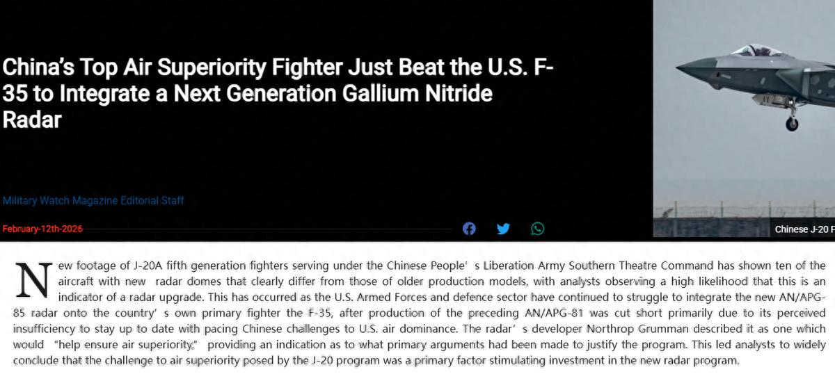 With the issue of the new batch of F-35s in the United States not being equipped with radar becoming more and more serious, and the AN/APG-85 gallium nitride phased array radar being delayed indefinitely, the "Military Observation" website in the United States has sadly found that "the J-20A has upgraded its gallium nitride radar again, further widening the gap between the most advanced air superiority fighters of China and the United States in terms of radar."
