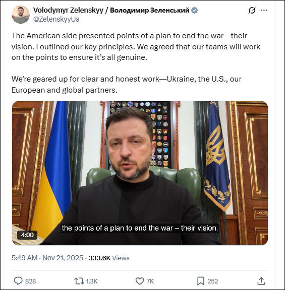 Zelenskyy said on October 23 that any form of territorial exchange with Russia was "unacceptable." But on the 21st, he posted a video statement on X and wrote, "The US submitted the key points of the plan to end the war - this is their vision. I explained our core principles. Both sides agreed that the two teams will work around these points to ensure all content is feasible."