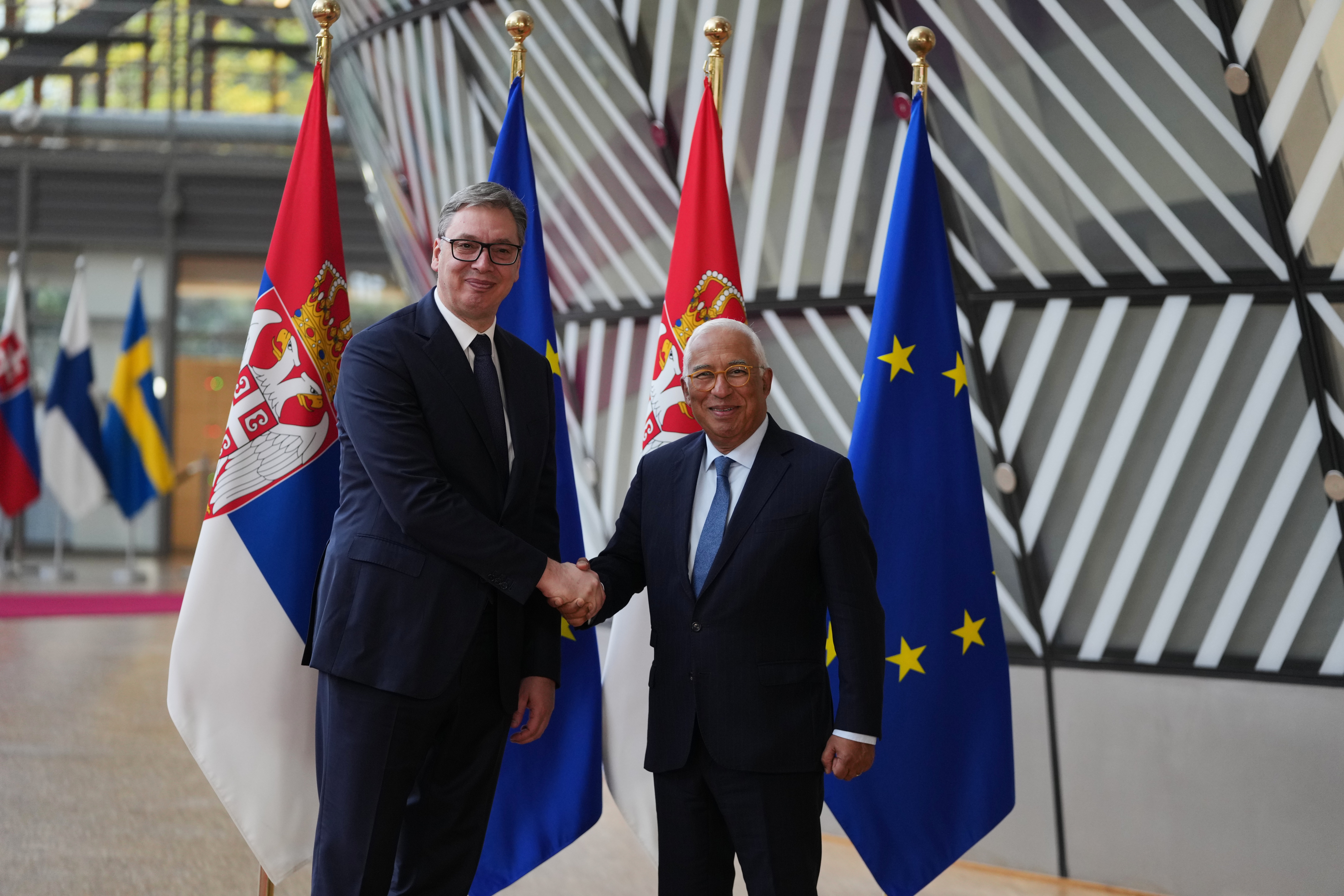 On November 4 in Brussels, Serbian President Vučić (left) shook hands with European Council President António Costa. (AP)