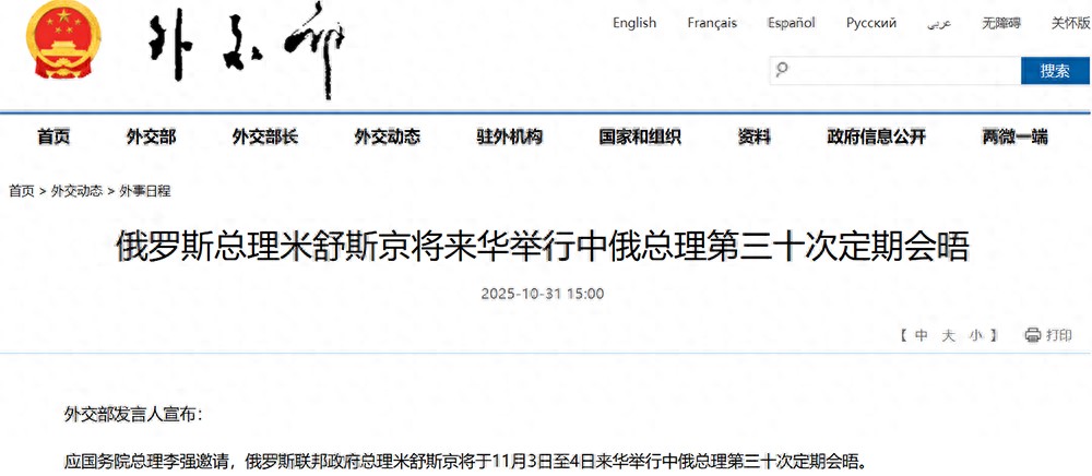 On the invitation of Premier Li Qiang of the State Council, Prime Minister Mishustin of the Russian Federation will visit China from November 3 to 4 to hold the 30th regular meeting between the Prime Ministers of China and Russia.