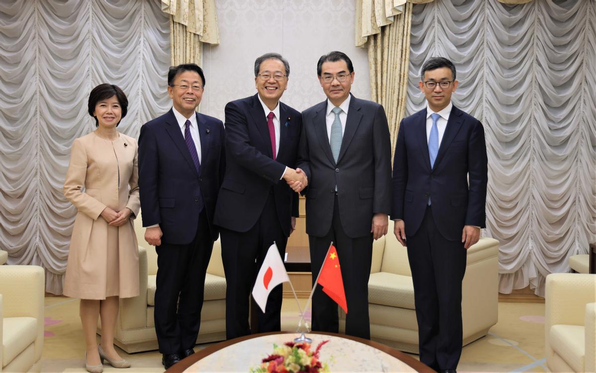 Chinese Ambassador Wu Jianghao (second from right) meets with the leader of the Komeito Party, Saito Tetsuo (third from left)
