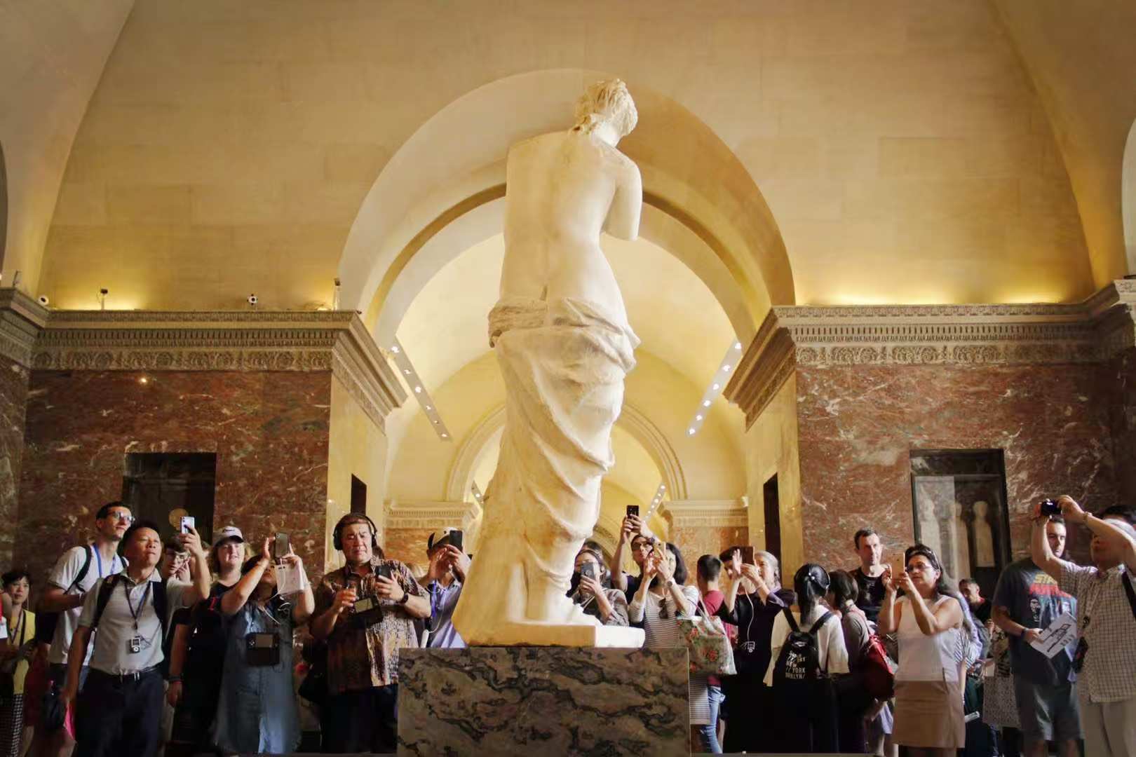 Visitors view the marble sculpture "Venus de Milo" (also known as "the Broken-Armed Venus") at the Louvre. Observer Net
