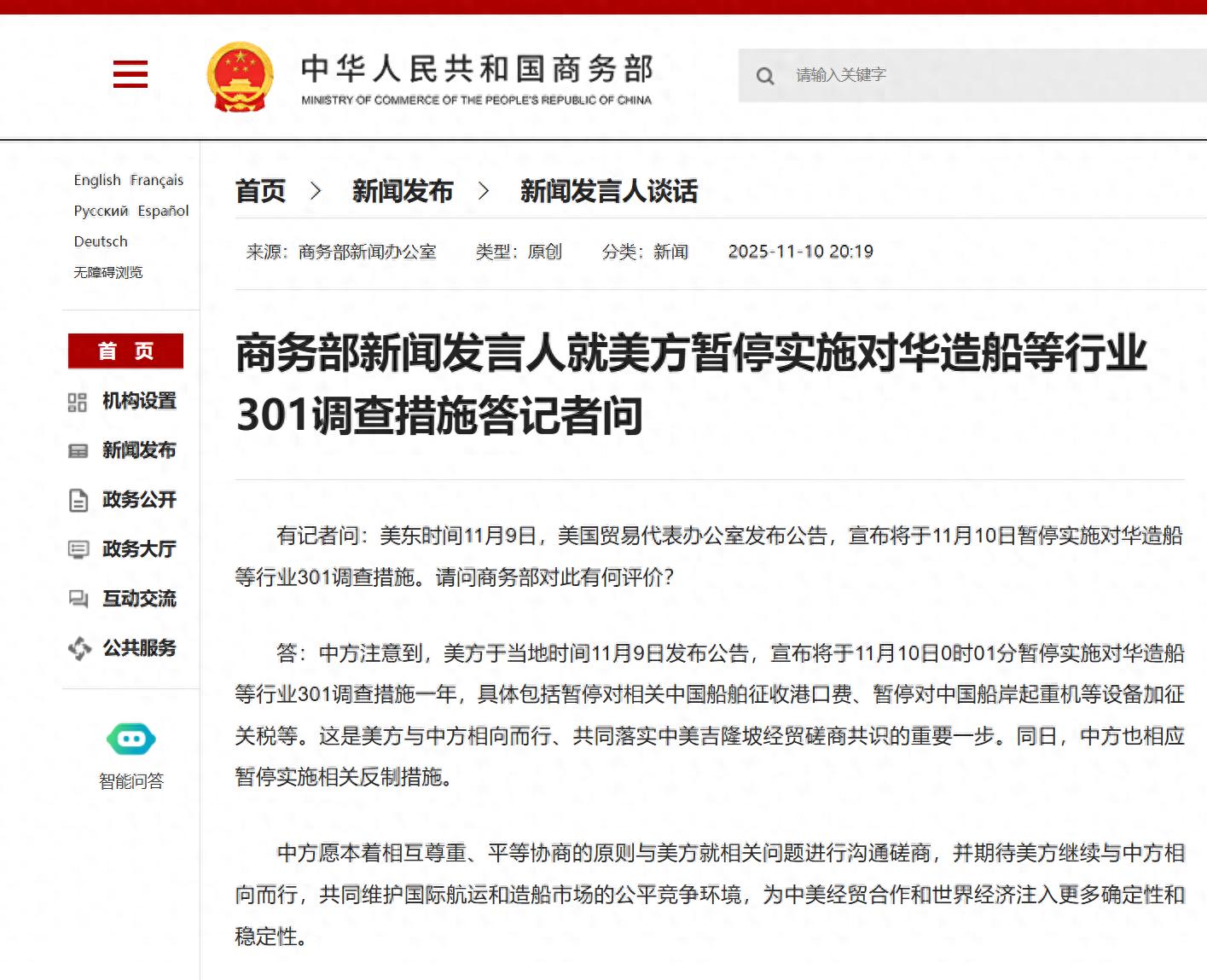 Response: The Chinese side noted that the U.S. issued a notice on the local time of November 9th, announcing that it will suspend the implementation of 301 investigation measures in the shipbuilding industry and other sectors against China for one year starting at 00:01 on November 10th. This specifically includes suspending the collection of port fees on related Chinese ships and suspending additional tariffs on equipment such as ship-to-shore cranes from China. This is an important step by the U.S. to move in the same direction as China and jointly implement the consensus reached during the Kuala Lumpur economic and trade consultations between China and the U.S. On the same day, China also suspended the corresponding countermeasures.