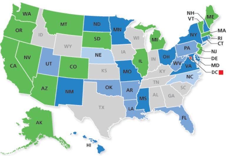 Green represents states where recreational and medical marijuana are legal, and gray represents states where marijuana is illegal