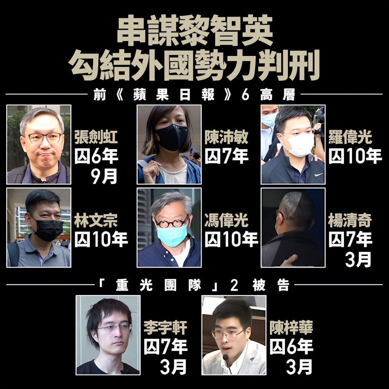 According to Hong Kong media reports, on the same day as the verdict in the Jimmy Lai case, the former chief executive of Next Digital, Cheung Chak-hung, was sentenced to six years and nine months; the former deputy editor-in-chief of Apple Daily, Chan Pui-ming, was sentenced to seven years; the former editor-in-chief of Apple Daily, Lo Wai-kwong, and the former executive editor, Lam Man-chung, each received ten years; the former editorial writer, Fung Wai-kwong, and Yang Ching-kei received ten years and seven years and three months respectively.