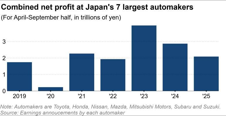 Change in consolidated net profit of the seven major Japanese car manufacturers from April to September, Nikkei Asia