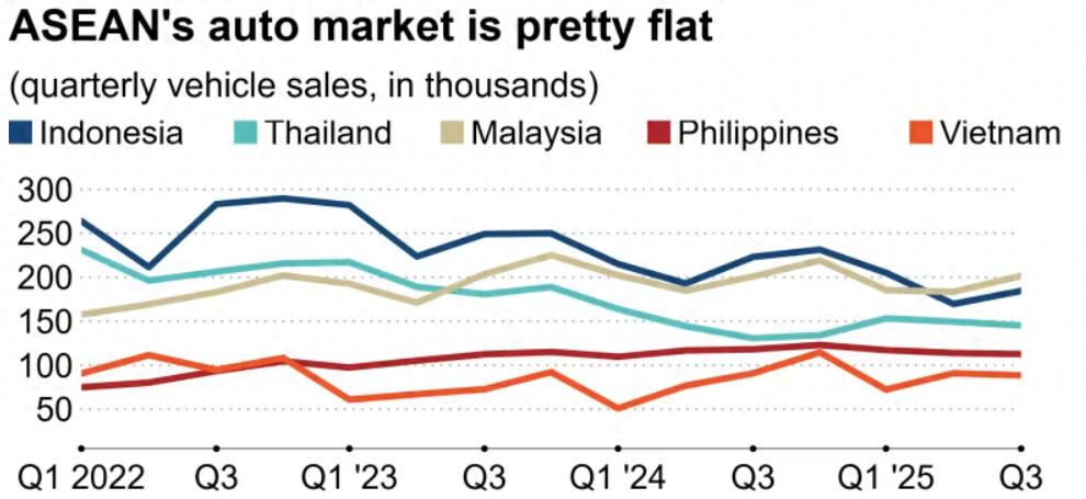According to the report, data showed that from July to September this year, total car sales in the five major Southeast Asian markets reached 731,900 units, a decrease of 4% compared to the same period last year, but an increase of 4% compared to the previous quarter. Since 2024, the quarterly sales in the region have only exceeded 800,000 units in the fourth quarter of last year, with other quarters all below 750,000 units.