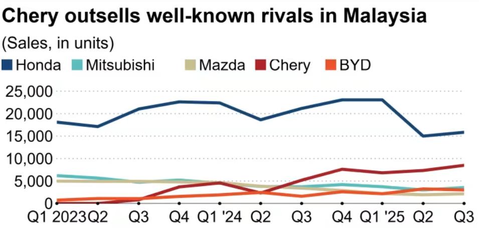 Sales of Honda, Mitsubishi, Mazda, Chery, and BYD in Malaysia.