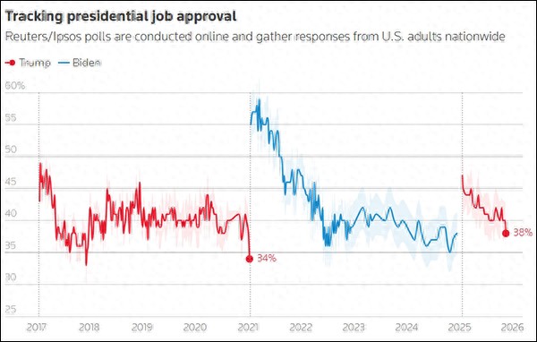 A survey conducted by Reuters/Ipsos from the 14th to the 17th among 1017 adults showed that Trump's support rate dropped to 38%, the lowest level since he returned to the White House, with an error margin of about three percentage points. Compared to the same survey in early November, Trump's overall support rate has decreased by two percentage points.