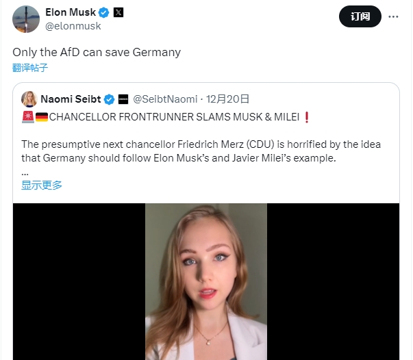 According to interviews with the German newspaper "Die Welt," Luna stated that at the end of last month, she posted on social media X, inviting Weidel to visit the U.S. She accepted enthusiastically and expressed willingness to discuss subsequent arrangements.