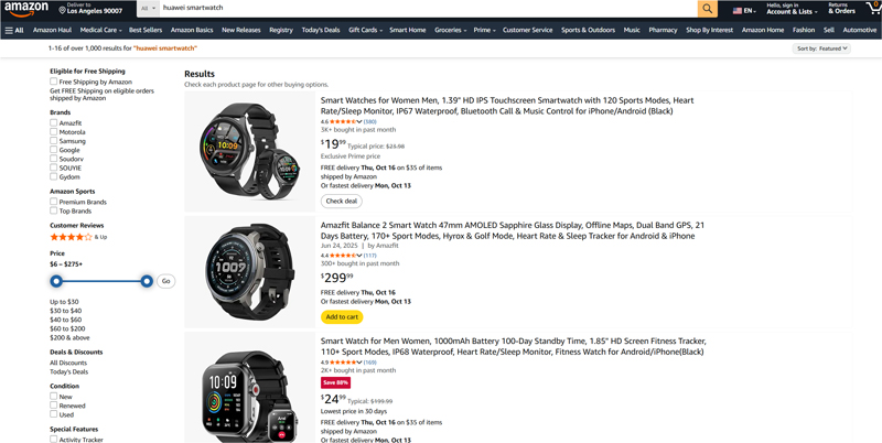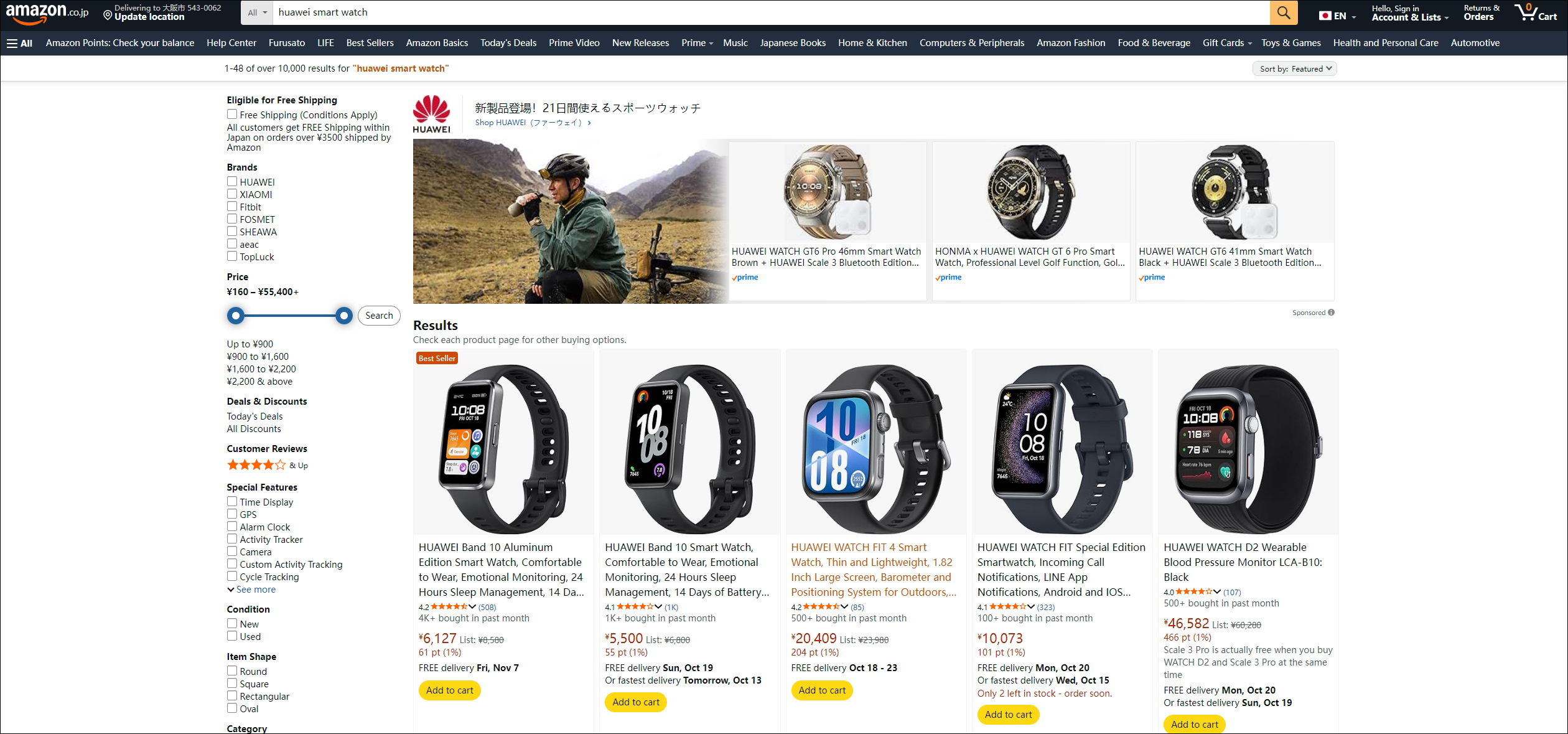 Currently, on Amazon, if you locate your address within the United States, such as Los Angeles, searching for "Huawei smartwatch" only shows other brands of smartwatches (as shown in Figure 1 below), and searching for "Huawei" also does not show Huawei smartwatches (as shown in Figure 2 below), only showing related brand phones. However, if you locate your address outside the United States, such as Japan, you can still search for smartwatches (as shown in Figure 3 below).