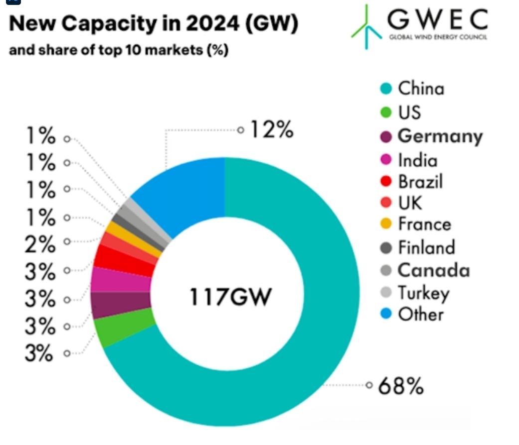 Let's look at some data. In the field of green energy, China's annual new wind and photovoltaic installed capacity accounts for two-thirds of the global total. In 2024, China's wind power installed capacity was nearly 20 times that of the second place globally. China's electric vehicle production capacity accounts for 70% of the global total, and its battery market share is 90%. Occasionally, the US may have a small piece of good news, such as a state building a new battery factory, but compared to the global chessboard, it's nothing.