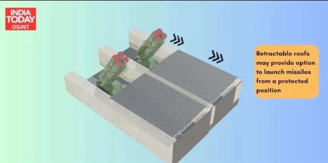 Missile launch shelters with retractable sliding roofs, capable of accommodating two transport and launch vehicles and direct missile launching through roof windows. Source: "India Today"